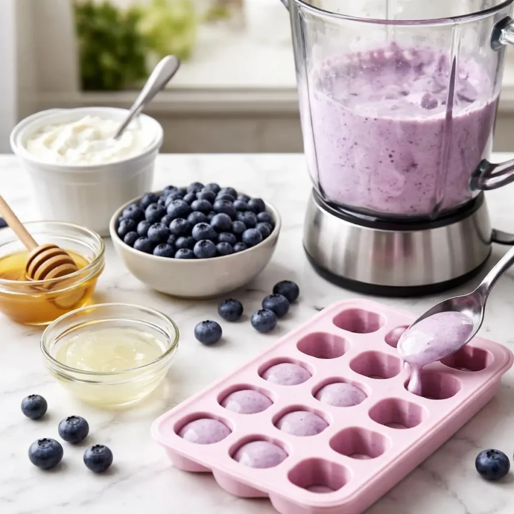 - Blend blueberries, yogurt, coconut oil, and honey until completely smooth.