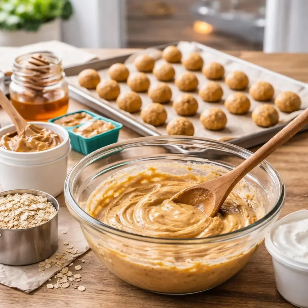 - Mix the peanut butter, honey, and Greek yogurt together in a large bowl until smooth.