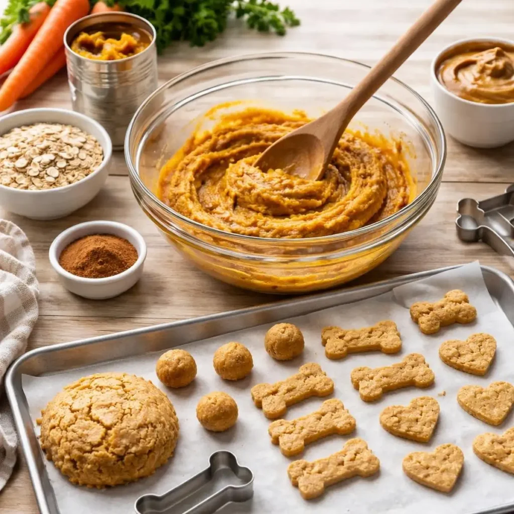 This one is IMO the most versatile recipe on the list. You can shape them, roll them, or just drop spoonfuls onto a tray — zero judgment here. The pumpkin-peanut butter combo is a proven winner in the dog treat world for a reason.