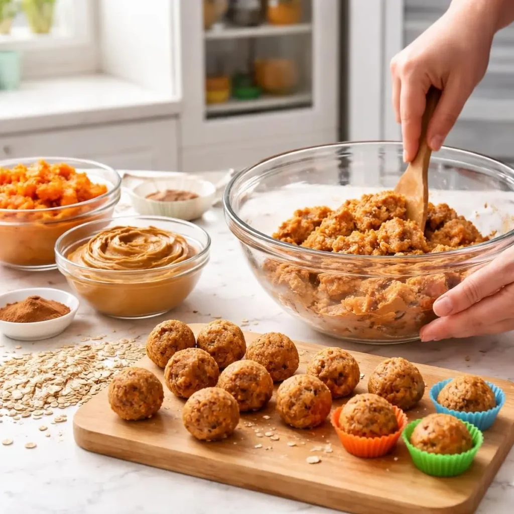 Sweet potato is one of those dog-food darlings for good reason — it’s packed with vitamins, fiber, and beta-carotene. These bites use cooked sweet potato as the base, and they’re hearty enough to work as a meal topper or a standalone treat.