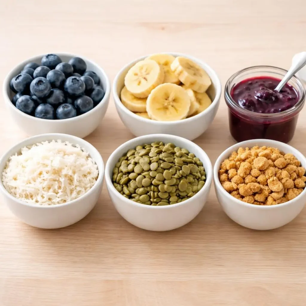 Avoid: Any topping containing chocolate, raisins, macadamia nuts, xylitol, or artificial color. Sprinkles marketed for pets are generally fine but entirely unnecessary given the natural color options above.