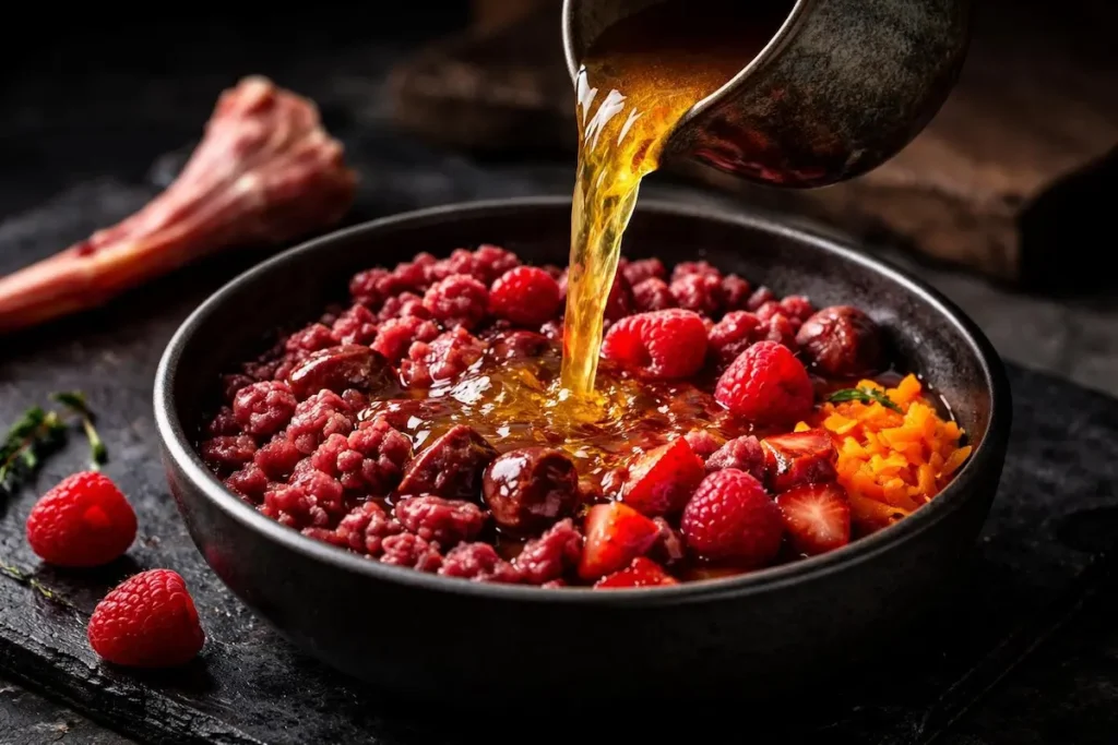 Bone broth is honestly the secret weapon of raw feeding. I started adding it to my dog’s bowl when she was being fussy during a transition week and she went from “suspicious sniffing” to “where has this been my whole life” overnight. The berries give the bowl a subtle sweetness dogs tend to love. Total prep time: 8 minutes.