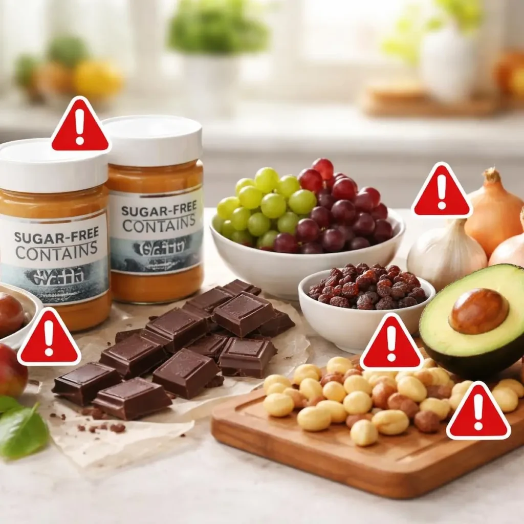 - Xylitol (found in some peanut butters and sweeteners — extremely toxic)
