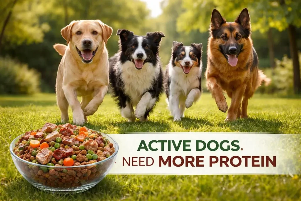 More movement means more muscle breakdown, more energy expenditure, and a significantly higher need for quality protein to repair, rebuild, and fuel everything that makes an active dog go.