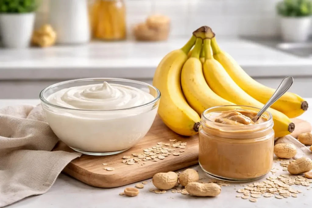 - Blend everything together. Add the yogurt, bananas, and peanut butter to a blender. Blend until completely smooth. No chunks — you want a creamy, pourable consistency.